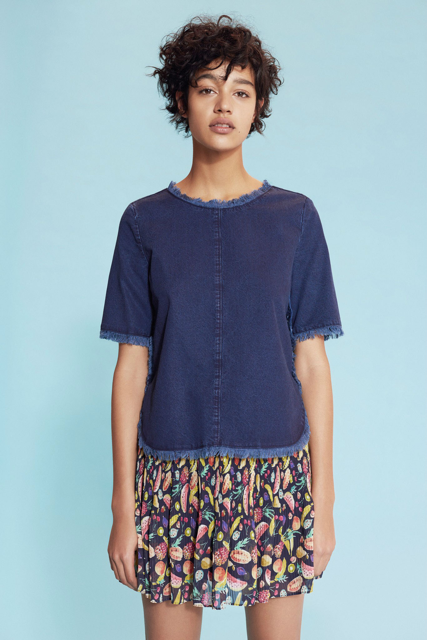 El mismo print que encontramos en el vestido anterior también podrás disfrutarlo en una falda mini plisada. No hay mejor forma de unirlo en un combo que con un top denim con los extremos flecados. ¡Chic y perfecta!