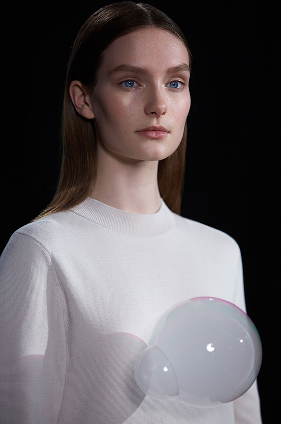 La instalación está realizada con materiales efímeros dentro de un nuevo contexto extraño: niebla llena de flores delicadas que desaparecen al entrar en contacto con la piel.