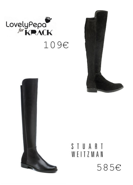 Nuestro favorito es el modelo “galgo afgano”, un clon de la popular bota 5050 de Stuart Weitzman que tanto gusta a las celebrities. Este los puedes encontrar en la colección de LovelyPepa por 109€.
