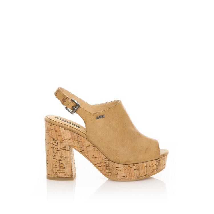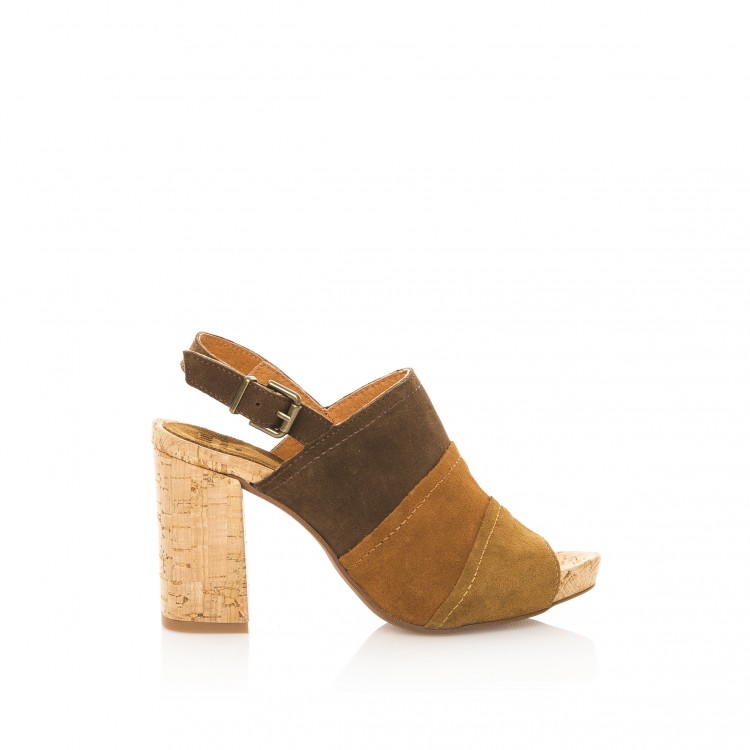 Sandalia-zueco con estética patchwork y serraje en tonos tierra. Sus materiales en corcho para el tacón y plataforma, y sus colores cálidos como los marrones o el mostaza nos aportan una sensación de calidez y serenidad ideales para las temporadas de primavera y verano.