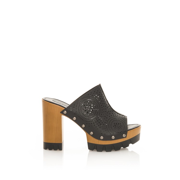 Sandalia estilo zueco, peeptoe y suela track. Sandalia con punta y talón abierta, tacón ancho y plataforma, decorado con tachuelas en el borde y estampado con agujeros. Los zapatos abiertos son muy cómodos para la primavera y con este diseño informal podrás darle un toque diferente a tus vaqueros campana o vestidos.
