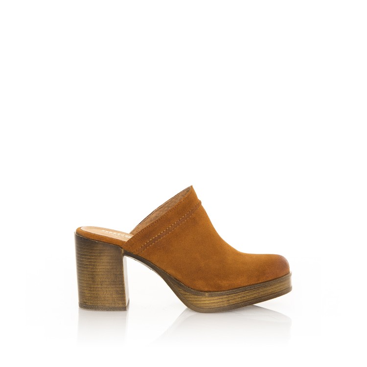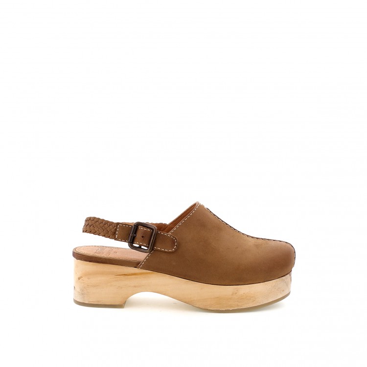 Zueco bajo con talón abierto y punta cerrada. En color café, de piel y con hebilla ajustable. Calzado perfecto para lucir en tu día a día por su comodidad y color.