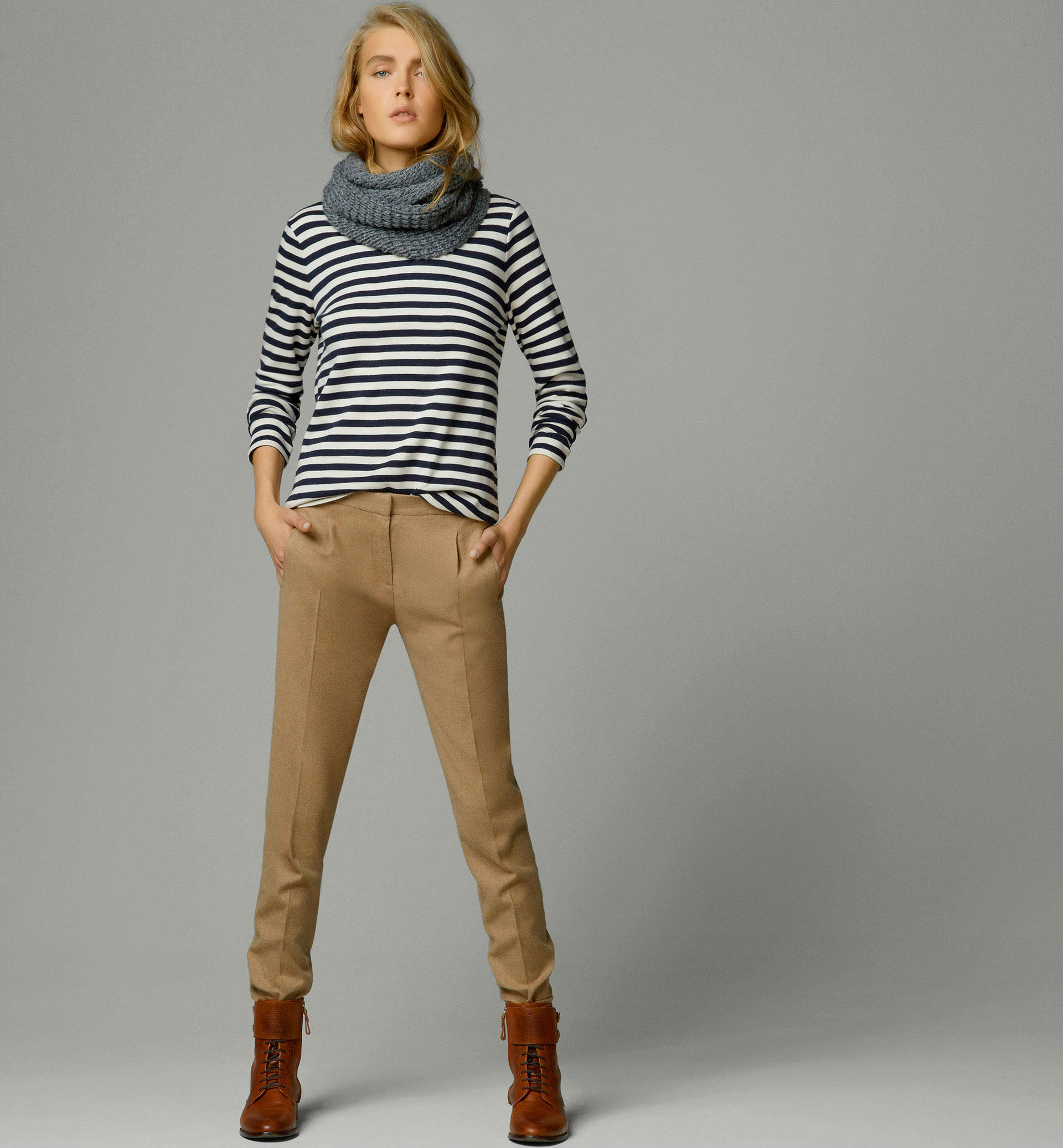 Look 1. Las rayas navy siempre son una apuesta segura. Combina tu camiseta marinera con unos pantalones de pinzas y botines.