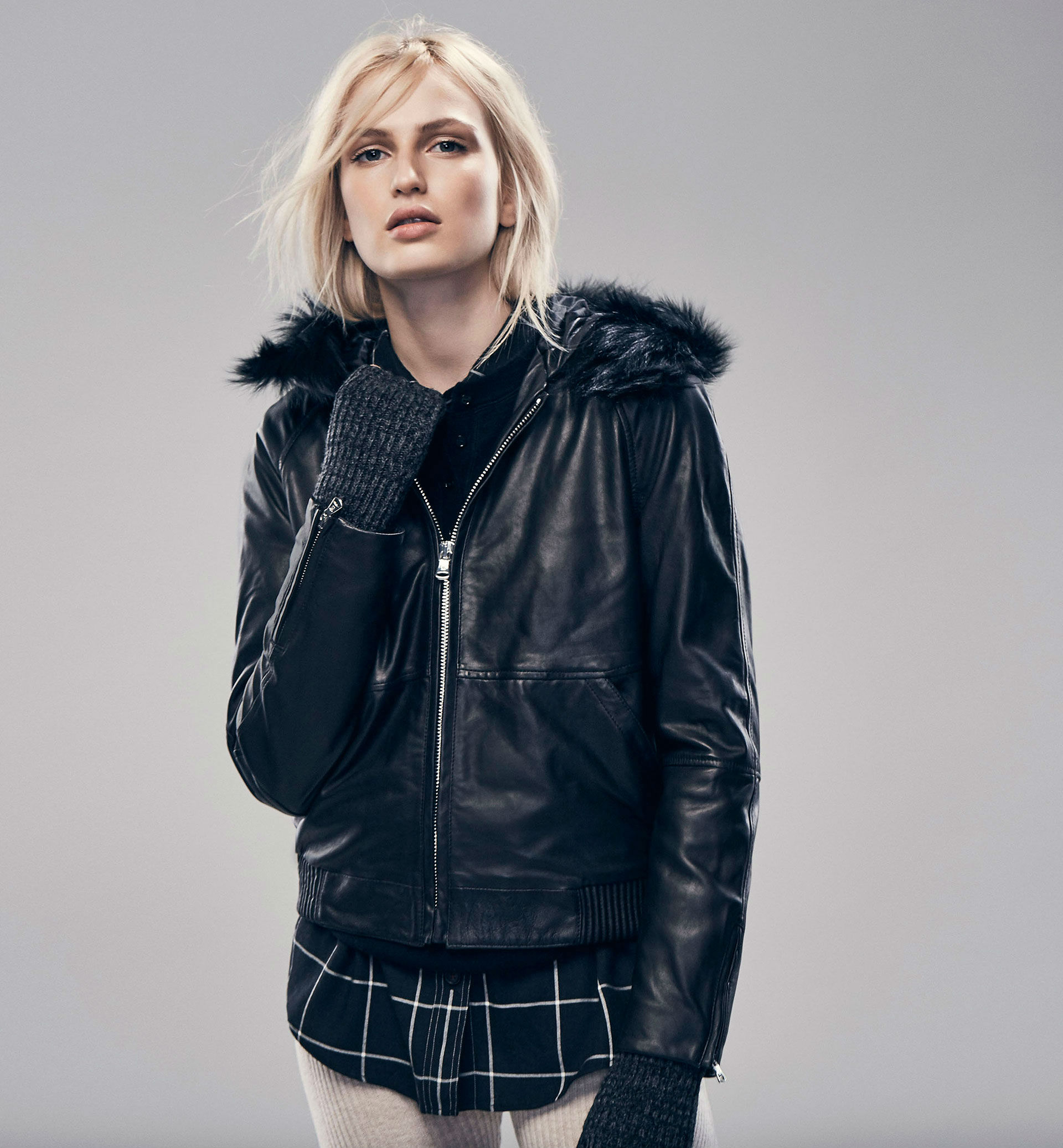 Cazadora tipo bomber, confeccionada en suave napa de 100% piel de origen nacional. Corte ligeramente abombado con bajo engomado, capucha incorporada ribeteada con pelo Toscana, cierre frontal mediante cremallera, dos bolsillos laterales, puños con cierre de cremallera, forro interior y detalle de doble canesú en la espalda. El largo de la prenda en la talla de la modelo es de 55 cm.