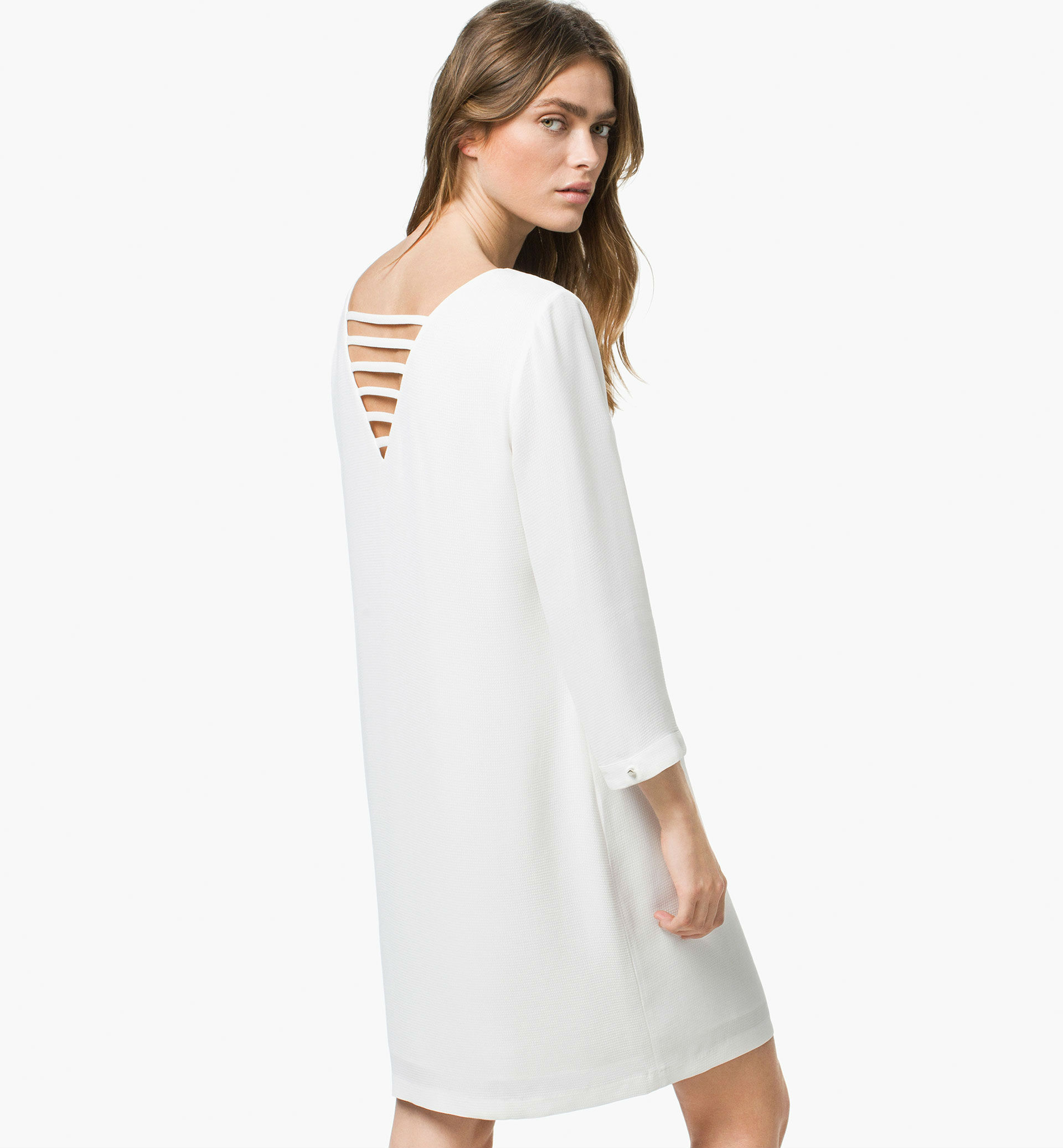 Vestido fluido, confeccionado en tejido de estructura, con corte recto, cuello redondo, escote fantasía a la espalda, manga tres cuartos, puños con un botón, y forro interior (49,95 €)