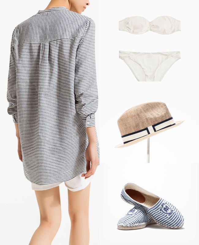 Este modelo de caftán más tirando a camisa que a túnica es precioso. Las rayas son tendencia indiscutible este verano y podrás crear un total look en blanco y azul marinero. Las espardeñas vienen pisando fuerte esta temporada. Es un calzado cómodo, romántico e ideal para las tardes relajadas de verano. Este modelo en concreto de Massimo Dutti son realmente adorables! No te olvides de un biquini en blanco ya que es un éxito asegurado