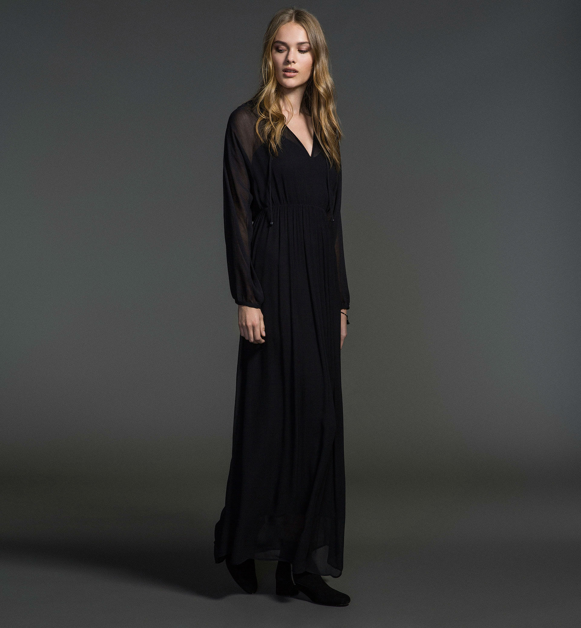 Vestido largo con corte a la cintura, confeccionado en un tejido fluido. Cuello redondo con escote pico y lazada ornamental, manga larga ligeramente abombada con puño abotonado, cintura elástica y forro interior. El largo de la prenda en la talla de la modelo es de 143 cm.