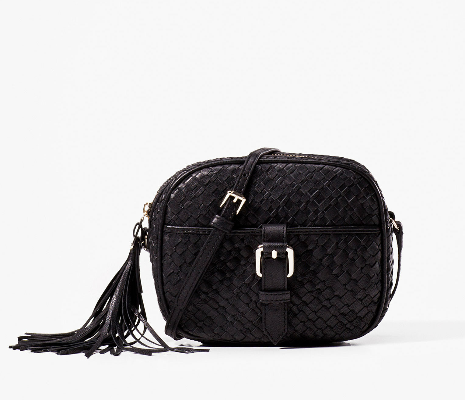 Bandolera con diseño trenzado, borla y hebilla ornamental, confeccionada en 100% piel caprina. Cierre mediante cremallera y tirador, un bolsillo externo, correa regulable, un compartimiento principal, un bolsillo interno con cremallera, y forro interior con emblema de la firma estampado.
