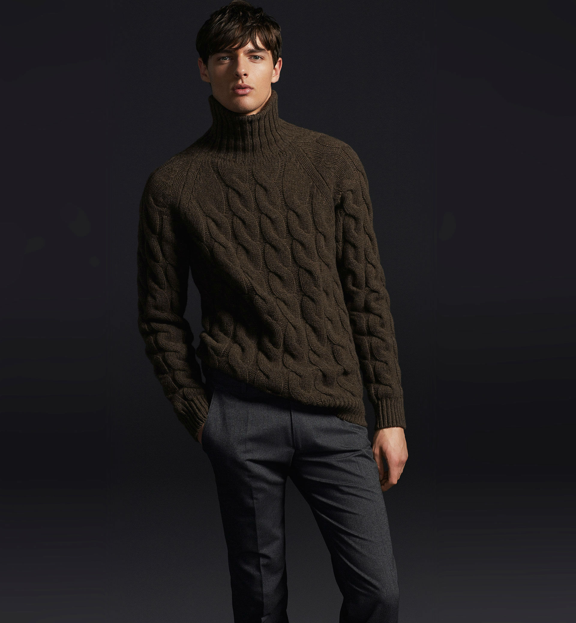 Jersey con diseño de trenzas, confeccionado en Italia en una delicada mezcla de lana y yak. Cuello cisne, manga larga, y bajo y puños acanalados.