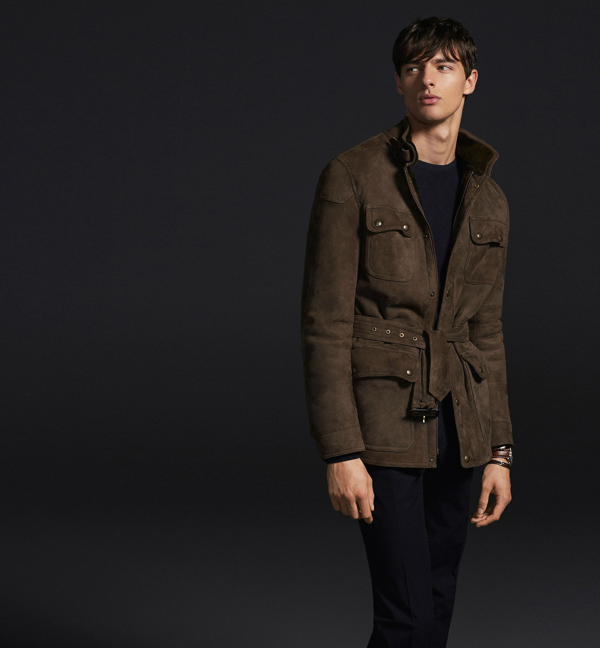 Chaquetón con diseño doble faz, confeccionado en 100% piel de origen europeo. Corte recto con ajuste de cinturón, cuello alzado con trabilla, doble cierre frontal mediante cremallera oculta y botones a presión. Presenta acabado en napa, cuatro bolsillos plastrón con solapa, un bolsillo interno, doble abertura en la parte posterior y manga con trabilla de ajuste.