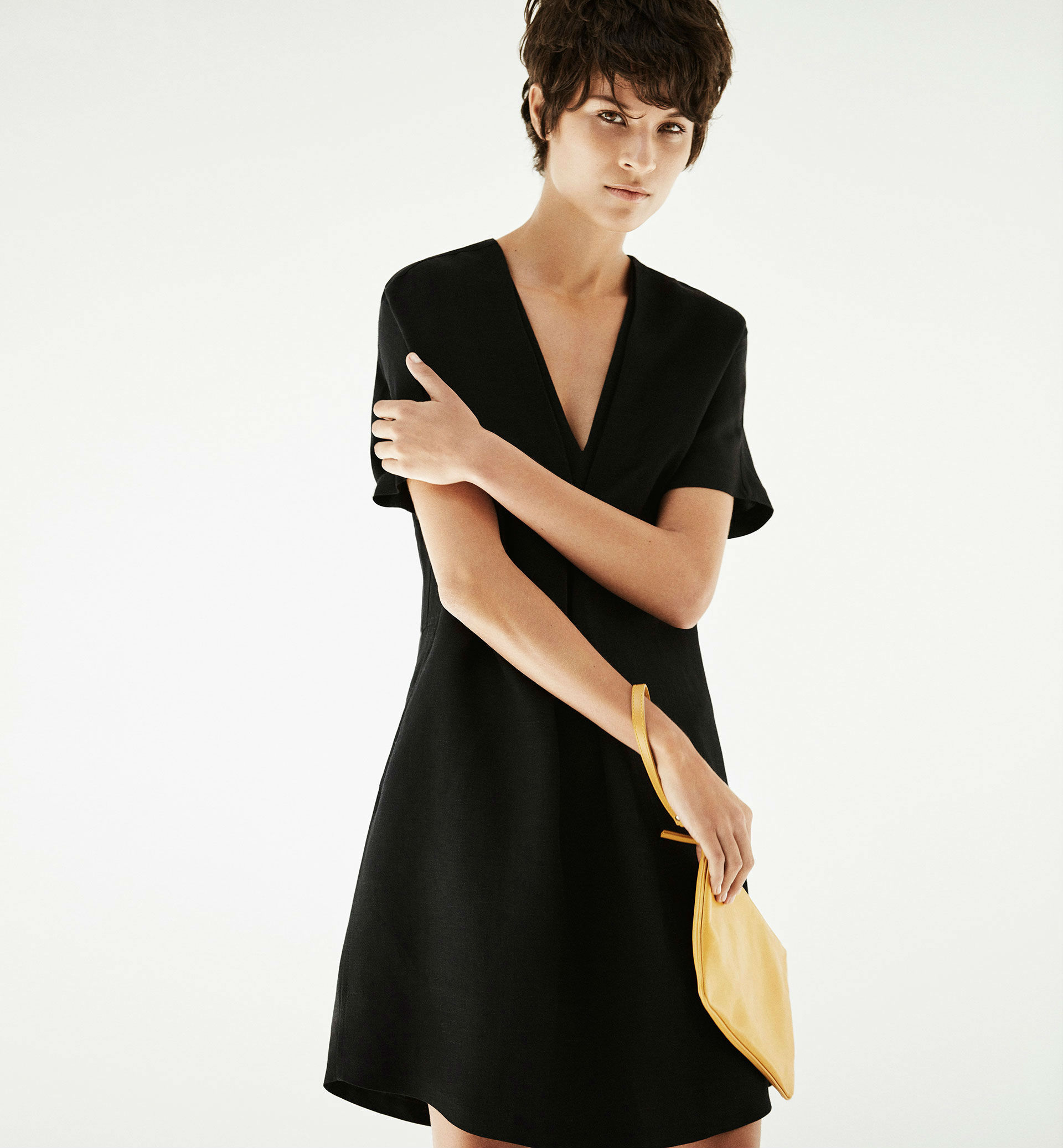 Vestido con original composición de paneles, confeccionado en una mezcla de lino y viscosa. Corte recto, escote en pico con efecto doble capa, abertura tipo tabla en la parte frontal, manga corta con hombro kimono y dos bolsillos laterales. El largo de la prenda en talla M es de 95 cm.