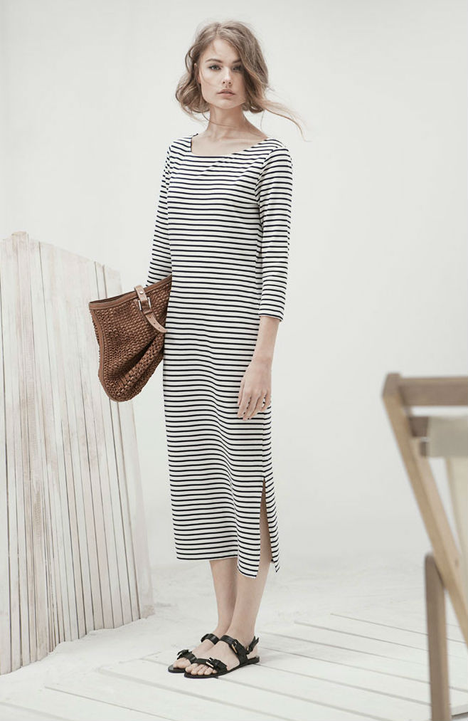 Vestido largo, con diseño de rayas bicolor, confeccionado en una delicada mezcla de algodón. Corte recto, cuello redondo, manga tres cuartos, y aberturas laterales para mayor comodidad. El largo de la prenda en la talla de la modelo es de 121 cm.
