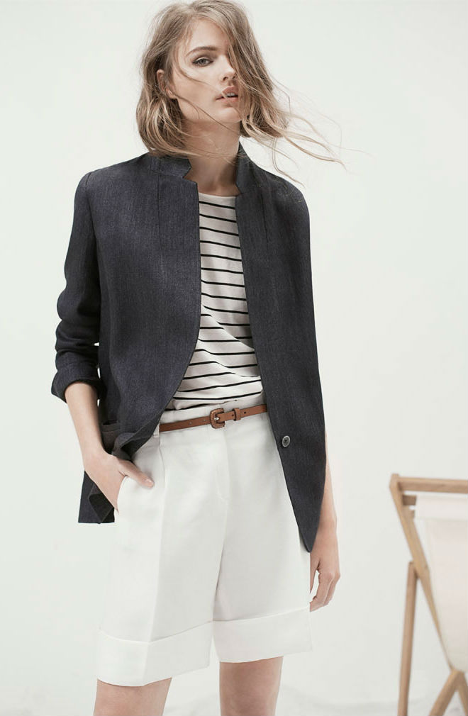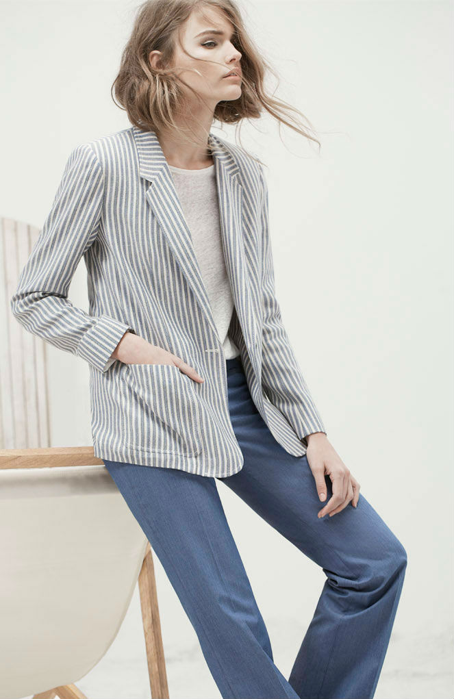 Americana de rayas, con diseño de estructura, confeccionada en una delicada mezcla de lino y algodón. Corte recto, cuello clásico, cierre de un botón, dos bolsillos de parche en la parte frontal, manga larga y semiforro interior.