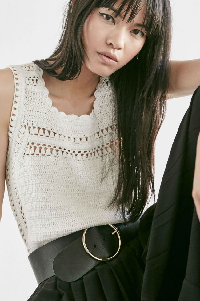 Top tejido de crochet en mezcla de algodón y seda morera. Presenta corte recto y escote cuadrado tanto en la parta frontal como en la posterior.