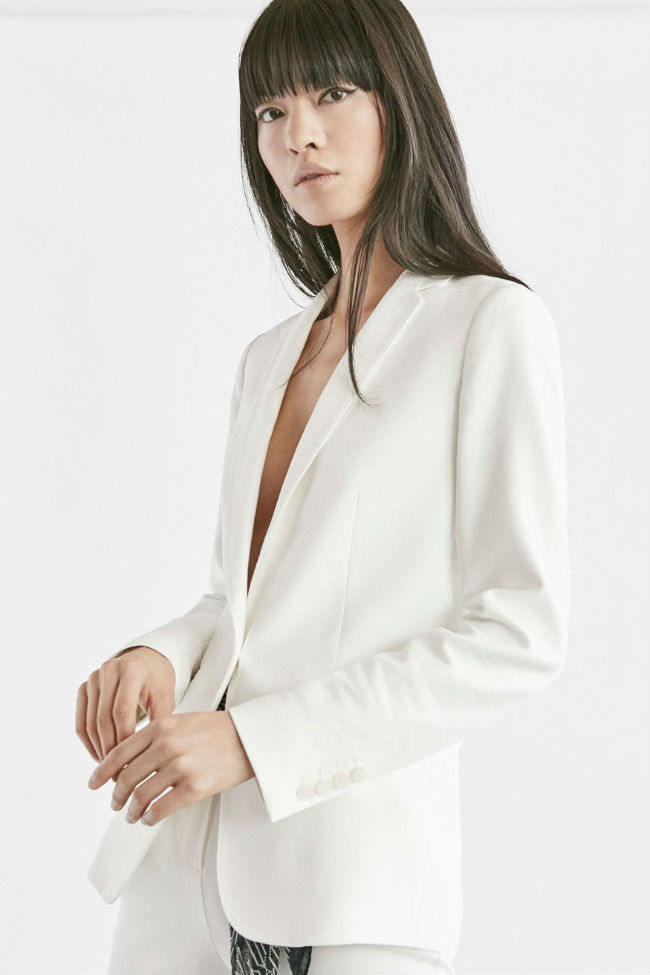 Americana de traje confeccionada en tejido italiano de 100% algodón. Corte ajustado al cuerpo, solapas de muesca, cierre de botón, dos bolsillos de ojal horizontales, puños con cuatro botones, abertura centrada en la espalda y semiforro. El largo de la prenda en talla 38 es de 64 cm.