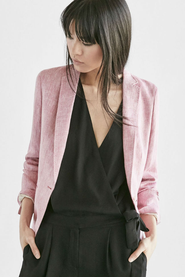Americana de 100% lino, con corte ajustado al cuerpo, solapas de muesca, cierre de botón, dos bolsillos de ojal horizontales, puños con dos botones, abertura centrada en la espalda y semiforro interior. El largo de la prenda en talla 38 es de 61 cm.