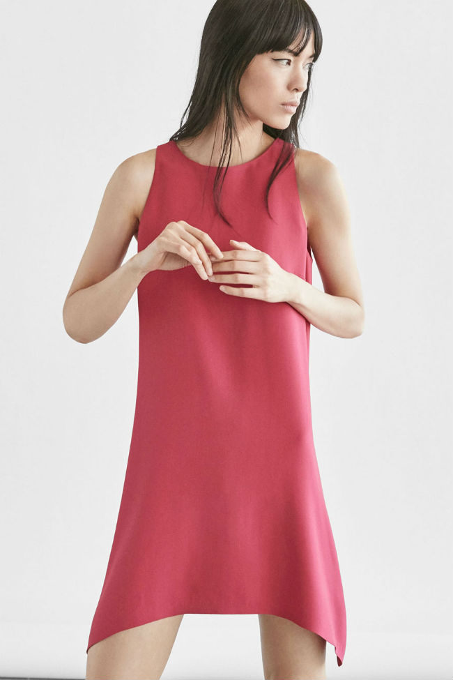 Vestido confeccionado en un tejido fluido, con corte acampanado y picos laterales alargados, cuello redondo, cierre mediante cremallera en la parte posterior y forro a tono. El largo de la prenda en talla 38 es de 88 cm.