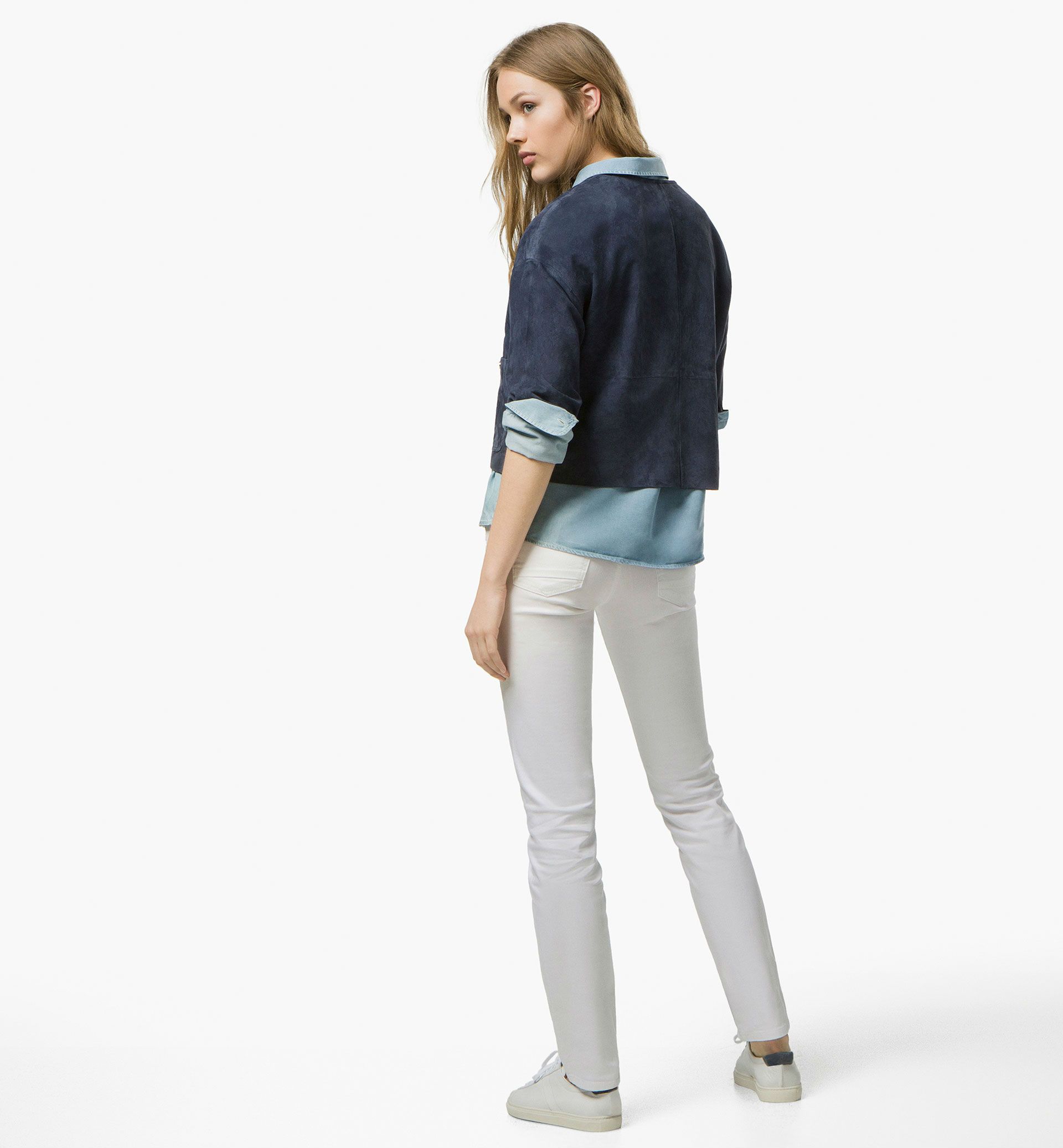 Pantalón tejanero cinco bolsillos, confeccionado en una mezcla de algodón y elastano que aporta a la prenda confort y elasticidad. Corte slim, tiro medio, cierre mediante botón personalizado y cremallera oculta, trabillas para el cinturón y emblema de la firma bordado a tono a modo de detalle.