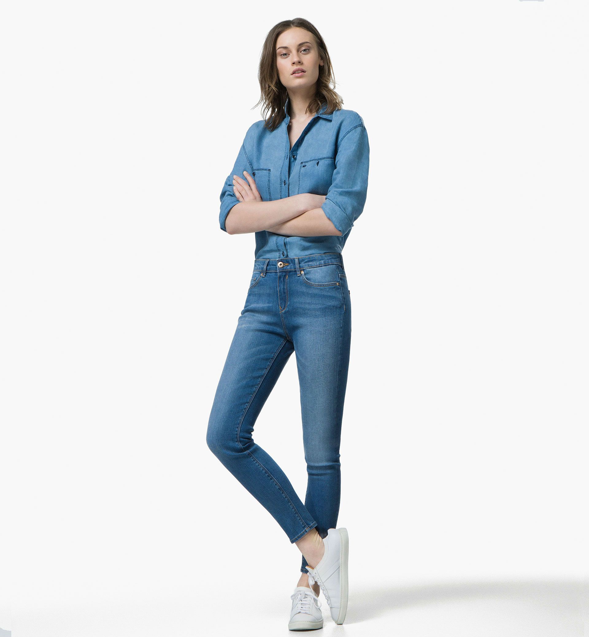 Pantalón tejano tobillero, con tiro alto y ligero efecto lavado, confeccionado en una mezcla de algodón y tejido elástico. Corte skinny, cierre mediante botón personalizado y cremallera oculta, cinco bolsillos, trabillas para el cinturón y ribetes a contraste.