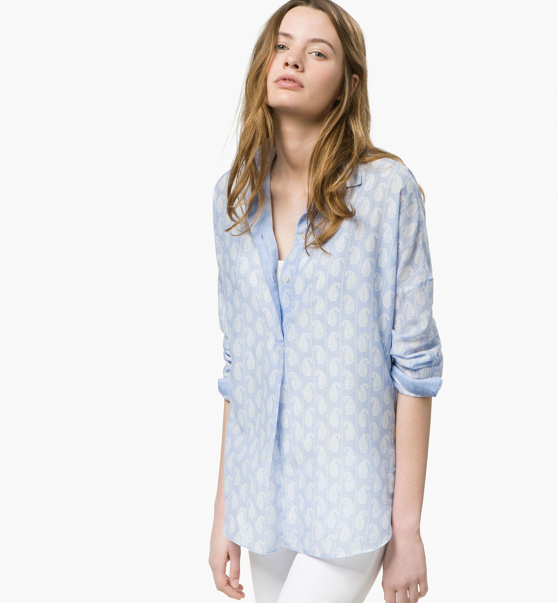 Camisa estampada, confeccionada en una delicada mezcla de seda y algodón, con cuello clásico, manga larga con costura caída, puños con cierre de un botón y bajos ligeramente redondeados.