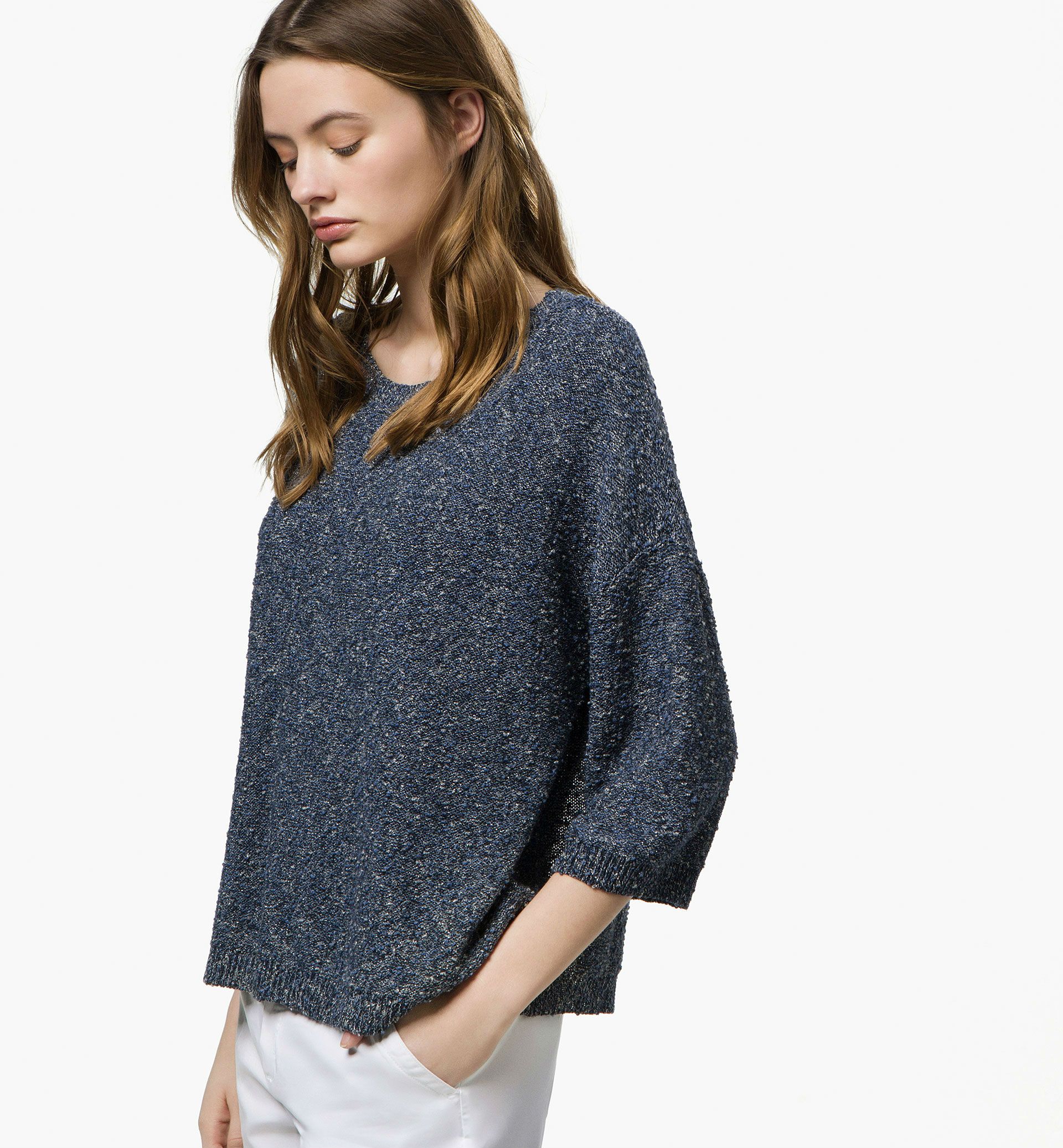 Jersey corto de punto con diseño fantasía y acabado metalizado, confeccionado en una delicada mezcla de algodón. Cuello semibarco, manga larga con costura caída, puños y bajos acanalados, y abertura central a la espalda.