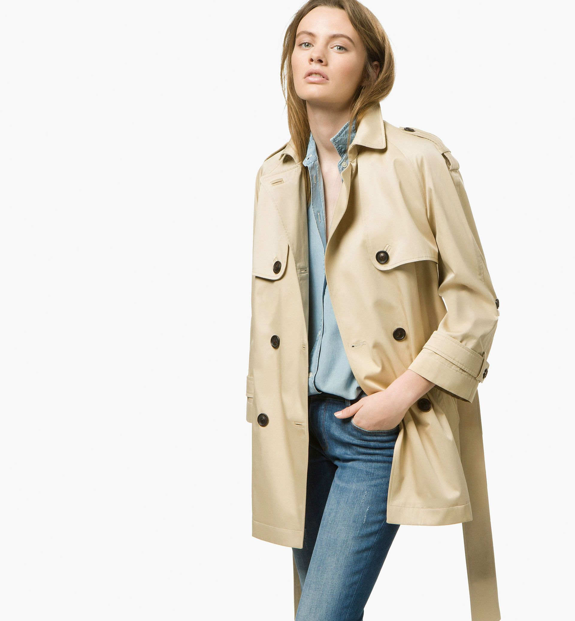Gabardina, confeccionada en 100% algodón, con corte recto, cuello clásico con trabilla abotonada, cierre de doble botonadura, dos bolsillos laterales, manga ranglán regulable mediante roll-up, cinturón, pliegue abotonado a la espalda, aberturas laterales y semiforro interior. El largo de la prenda en la talla de la modelo es de 77 cm.