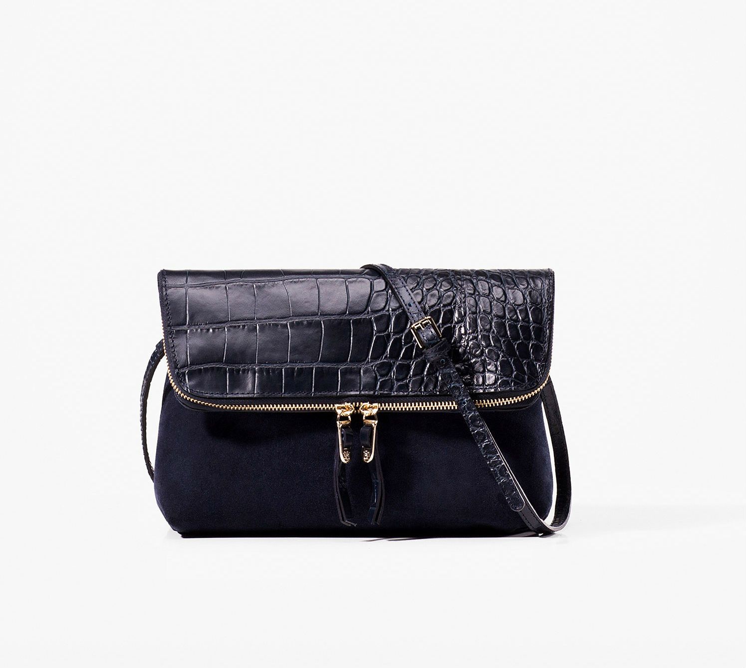 Bolso tipo bandolera, con diseño contrastado, confeccionado en España en 100% piel vacuna. Doble cierre mediante cremallera personalizada y solapa imantada, correa regulable y desmontable, un compartimiento principal, un bolsillo interno con cremallera y forro interior con emblema de la firma estampado.