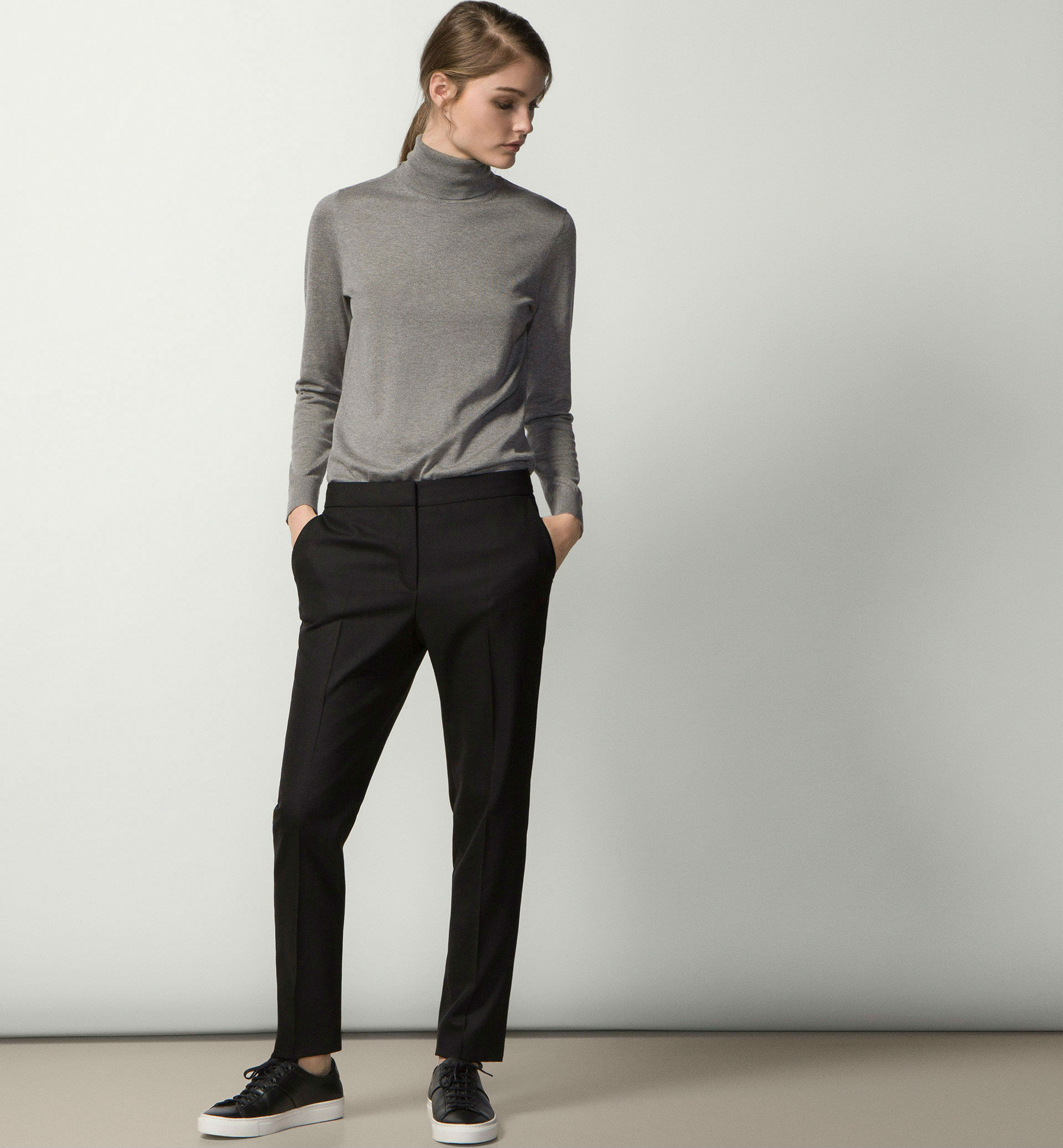 Aunque, como bien dice su nombre, el traje de chaqueta esté compuesto por dos piezas, también puedes emplear las prendas por separado. Un claro ejemplo es este look, en el que el pantalón de tejido italiano se postula como la parte más elegante, mientras que el jersey de cuello cisne pone el toque más básico.
