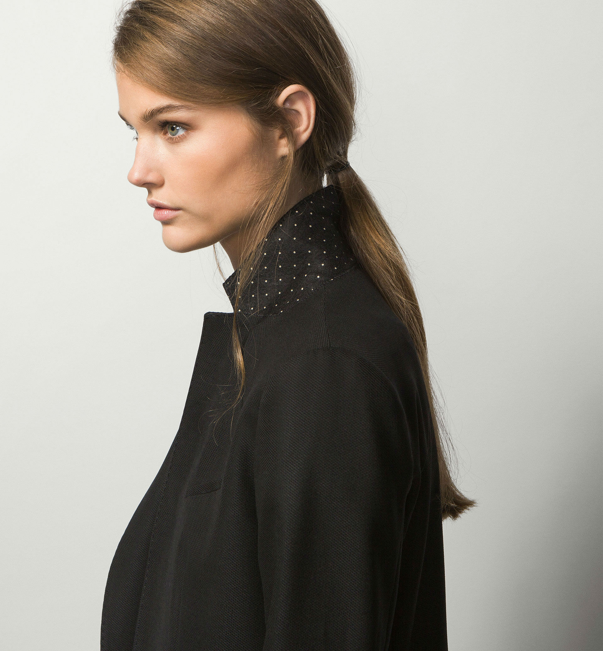¿Azul o negro? En realidad el color no importa, ambos conquistan desde el minuto 0. Emplea una camiseta básica para rematar un outfit plenamente estructurado. Son los detalles los que marcan la diferencia, como el bajocuello con print de polka dots o las aberturas posteriores.