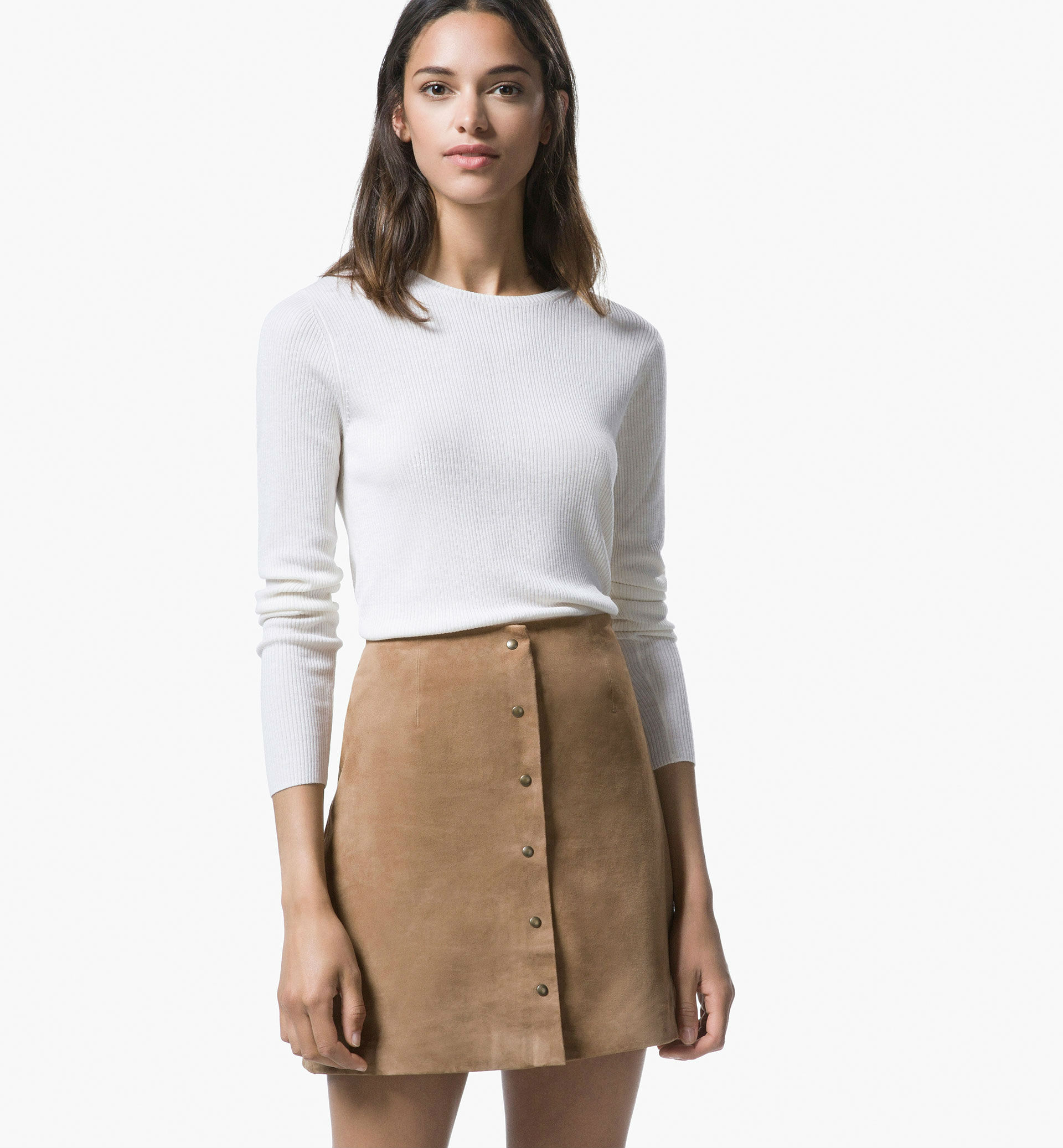 Las faldas de ante se han convertido en una de las prendas estrella de la temporada. Sus botones centrales, el corte de talle alto y su textura son los principales atractivos de este producto.