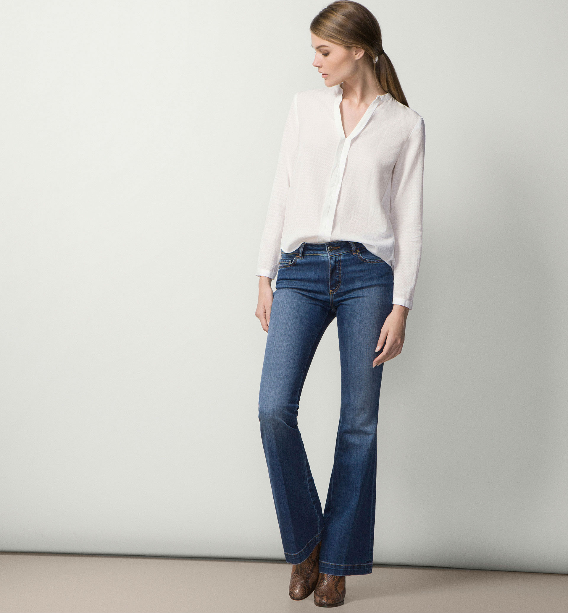 Pantalón de corte acampanado, confeccionado en tejido denim de algodón ligeramente elástico. Diseño cinco bolsillos, cierre mediante botón personalizado y cremallera oculta, y trabillas para el cinturón.