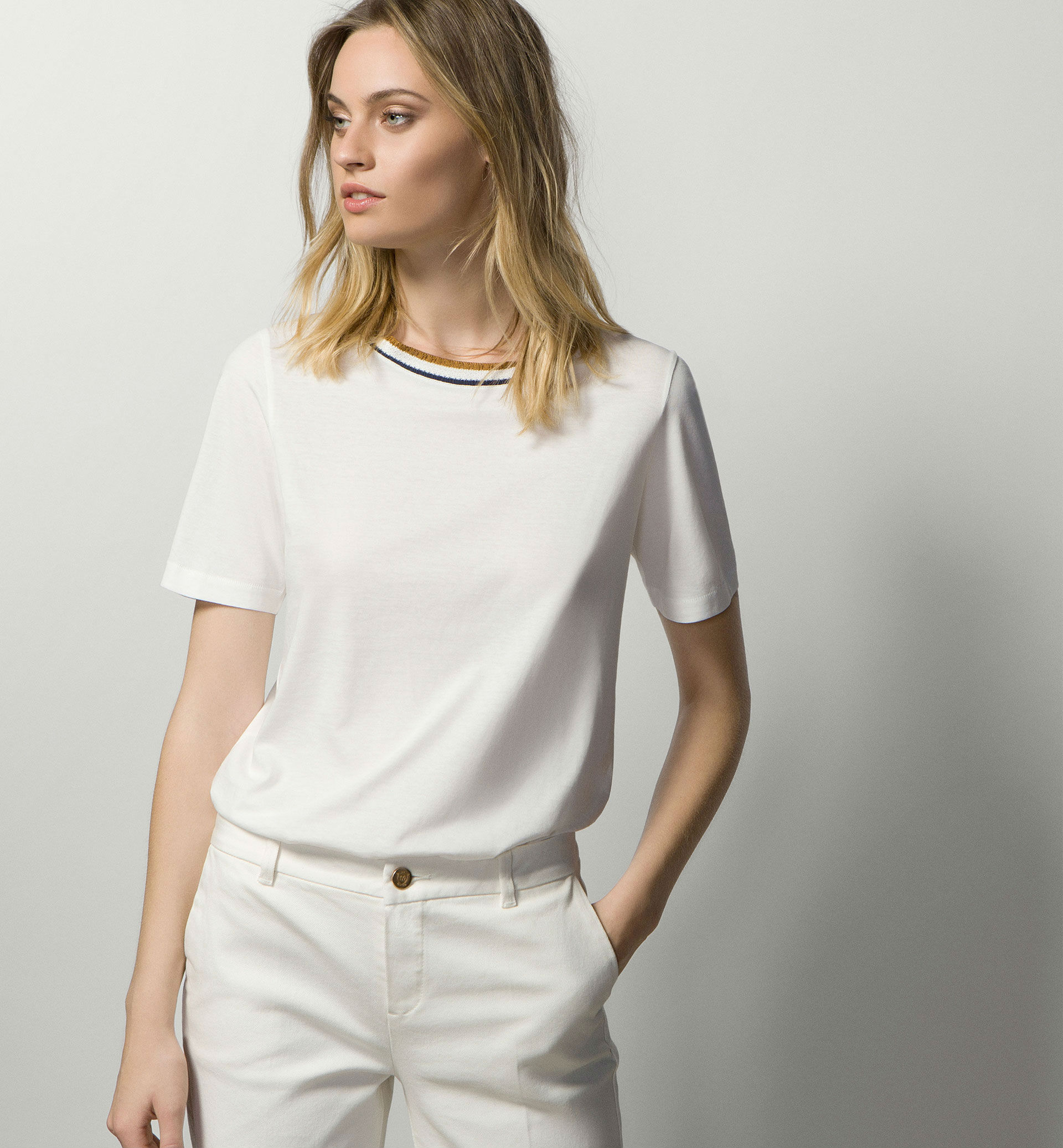 La marca se inspira en el estilo minimalista eligiendo un total look white como apuesta segura. Los formatos limpios y puros quedan patentes en este combo que, además, incluye un pequeño detalle de color en el cuello de la camiseta.