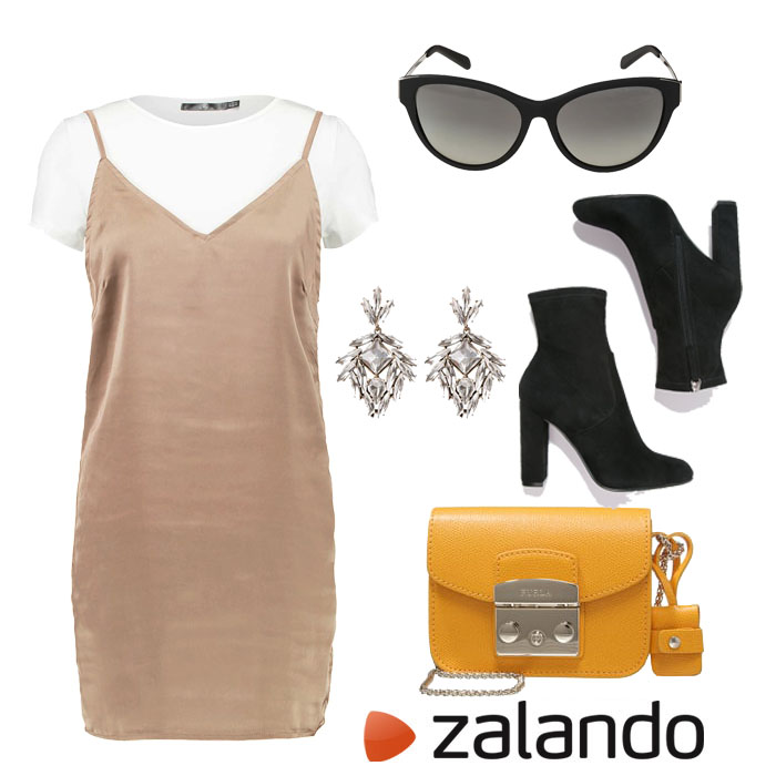 Los sábados por la tarde están reservados a las divertidas quedadas con las amigas. Si quieres ser la envidia de todo tu grupo, este es el estilismo que debes llevar. La opción que te mostramos está compuesto por un vestido dorado al más puro estilo de los años 90 de Zalando, para darle máximo glamour debes calzarte unos botines negros de caña media. Como complementos, opta por unos pendientes joya y unas gafas de sol que acompañen a un bolso bandolera en color amarillo, la guinda del look.