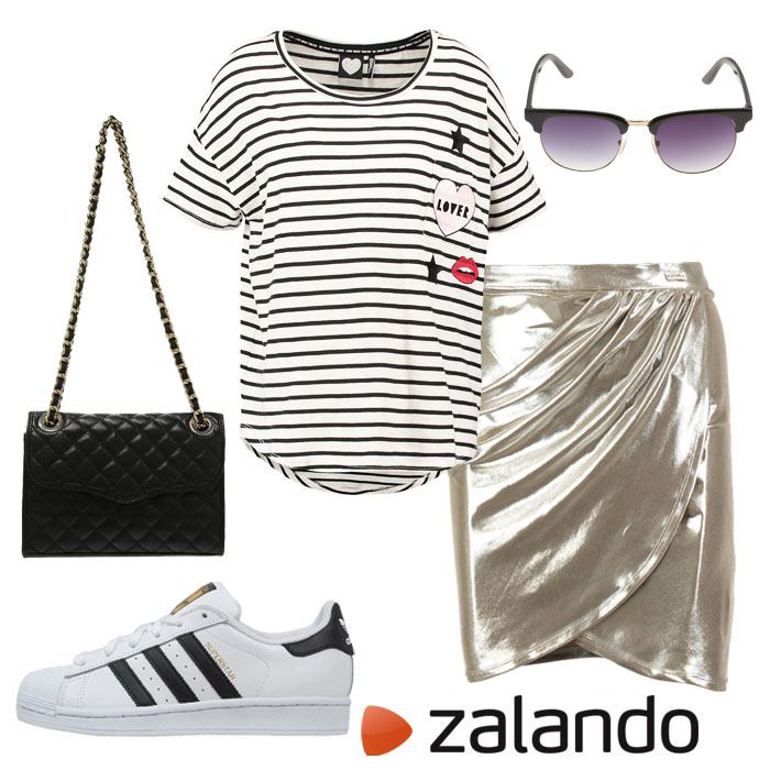 Los metalizados no están reservados para la noche, también puedes adaptarlos a un look de día y aquí tienes la prueba. Con la nueva colección de Zalando hemos creado este outfit que reúne todas las tendencias de la temporada: camiseta de rayas con parches, falda dorada con drapeado y sneakers blancas de Adidas. Estos tres productos unidos dan lugar a un look casual y chic que podrás lucir en tu día a día. ¿Qué te parece?