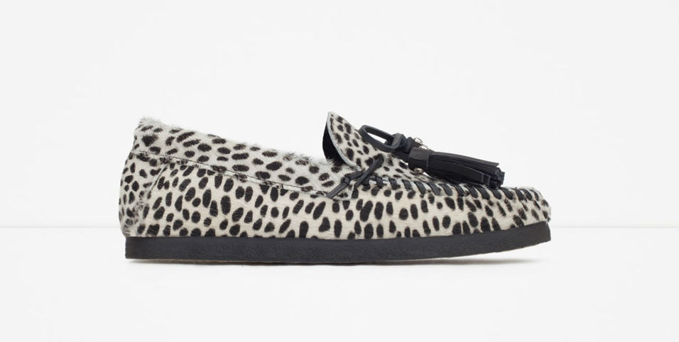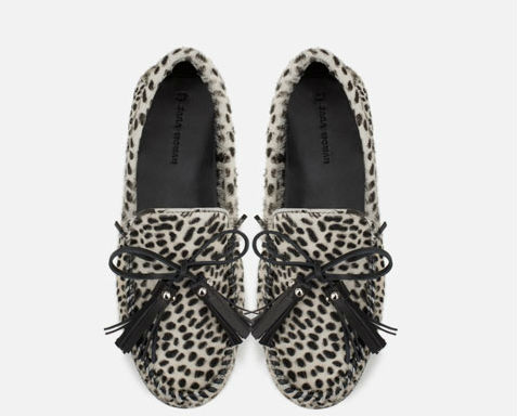 Echando un vistazo a la colección de calzado otoño invierno 2015/16 de Zara, nos hemos topado con unos mocasines muy similares a los de la firma high class. Es un calzado plano de piel con pelo natural de vacuno, print animal y detalle de borlas en el empeine. La suela de caucho en color negro aportará comodidad las 24 horas del día ya que su altura es de 1 cm. ¿El precio? En Zara las encontrarás por 49’95€.