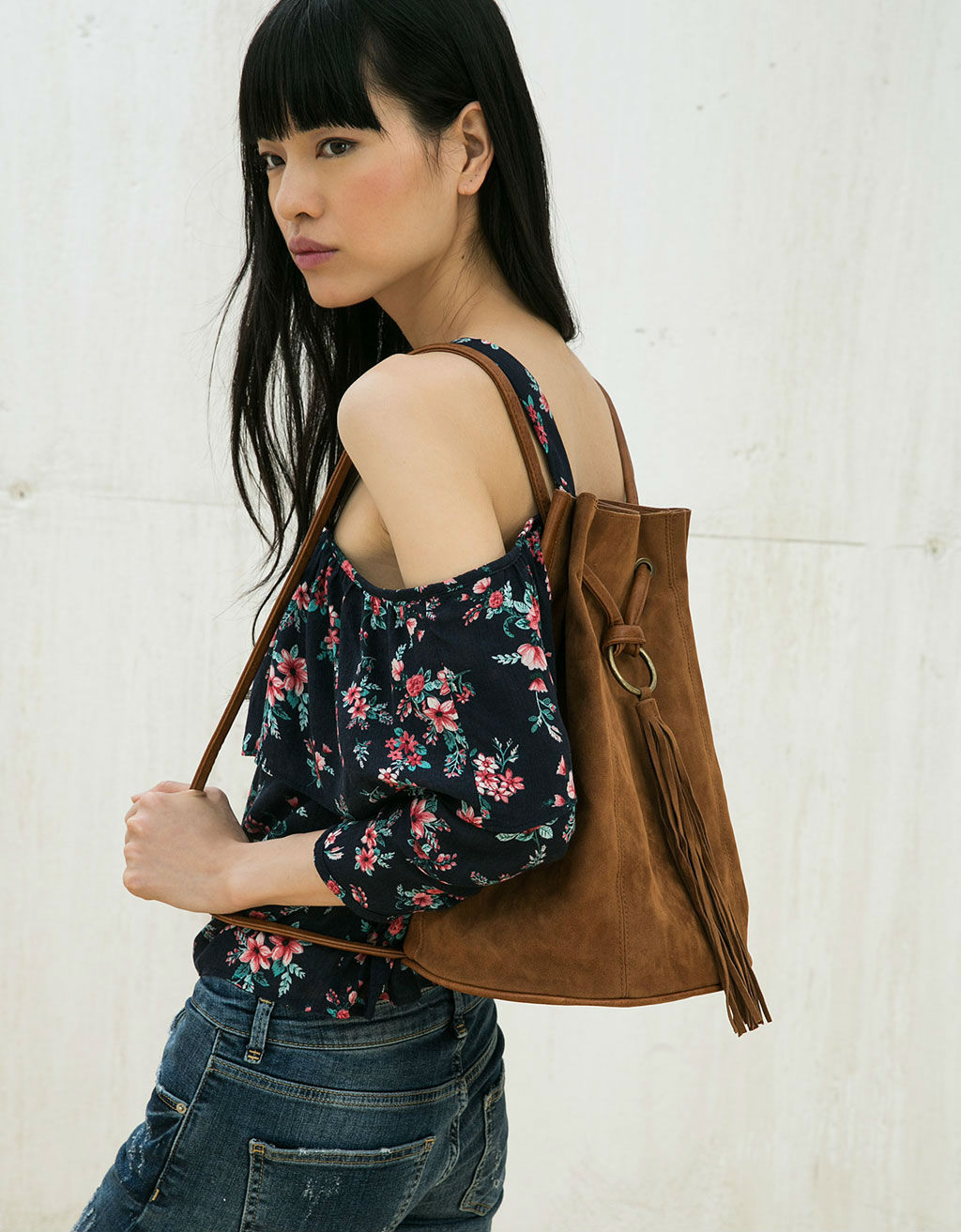 Aquí va una de las propuestas que más nos ha llamado la atención en el sector delas mochilas. Bershka muestra su lado boho chic con esta mochila-saco que cuenta con un favorecedor aplique redondo y flecos.