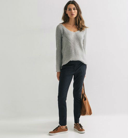 Un jersey básico puede jugar un papel protagonista en un estilismo Sporty Chic. Un claro ejemplo este modelo de punto gris que la firma adereza con unos pantalones de pinzas y unas deportivas. Las tonalidades neutras dejan paso al camel más llamativo, mostrando que con tres sencillos colores puede conseguirse un look de 10.