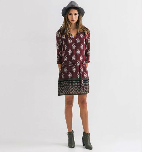 Su color y su print van a conseguir que nuestro look se inspire en el estilo Boho Chic. Gracias a su tejido ligero, la comodidad estará asegurada y, sin ninguna duda, también el estilo. ¡Combina este vestido con unos botines y un sombrero!