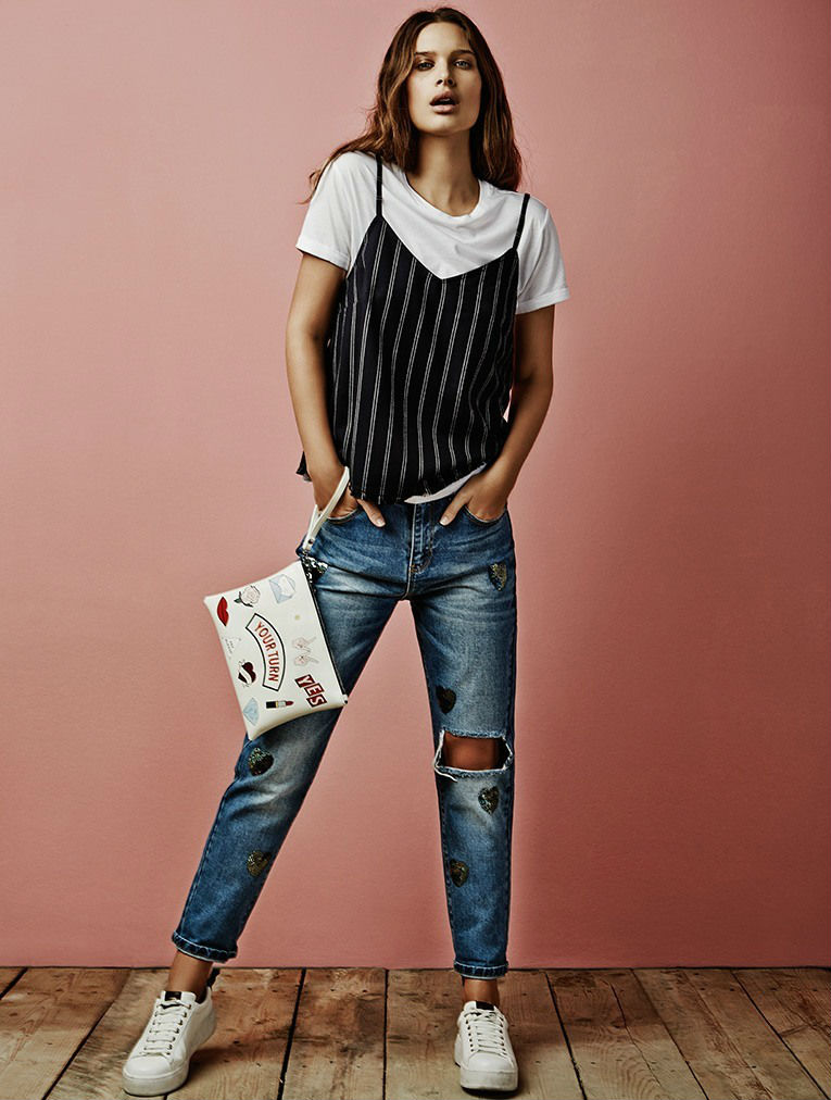 En esta imagen se aprecia cómo mezclar dos de sus imprescindibles (parches sobre denim y print de rayas diplomáticas) en un mismo look. La superposición del top con la camiseta termina de proporcionar al conjunto ese allure noventero y un tanto grunge.