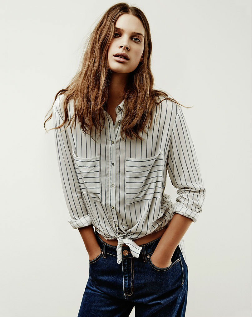 Tratándose de una colección inspirada en los 90, no podían faltar las camisetas y camisas anudadas. Stradivarius las combina con pantalones culotte, cargan de romanticismo las propuestas casual chic de la firma.