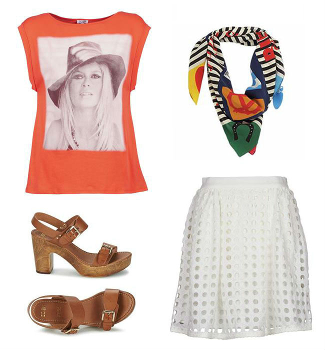 Ahora que los troquelados están acaparando todas las miradas, es el momento perfecto para lucir la tuya. Una prenda que casará muy bien con unas elegantes sandalias de piel y tacón de madera, un must have cómodo que estilizará tu figura. Como guindas del outfit hemos elegido una camiseta con la imagen de la icónica Brigitte Bardot y un pañuelo cargado de vitalidad gracias a su estampado.