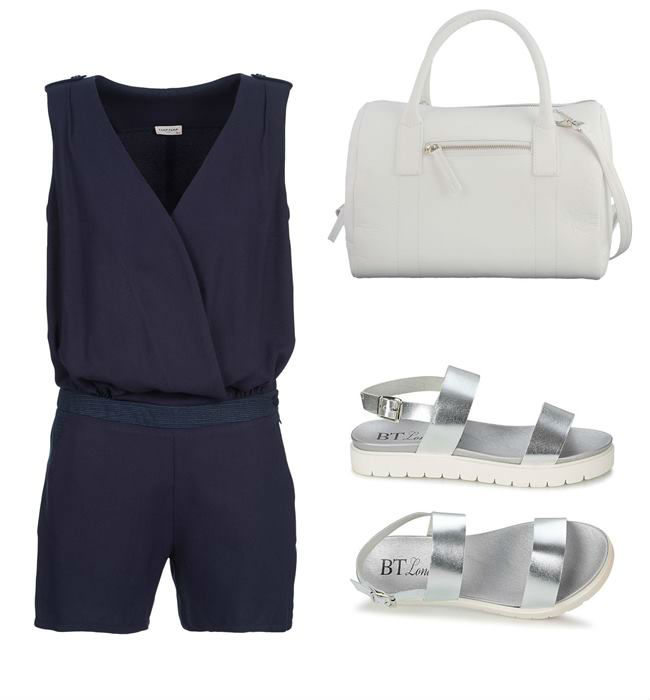 Seguimos con los monos pero esta vez en su versión más mini. El color azul oscuro se ha convertido en uno de los sustitutos del negro, una tonalidad versátil e inspirada en las profundidades del mar. Adereza este artículo con complementos que den luz a la prenda, como unas flatforms metalizadas y un bolso shopping en blanco.