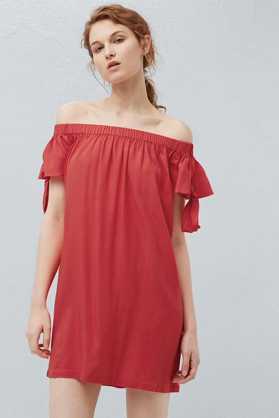 Mango y el rojo coral. Este vestido rebajado, off the shoulder, tiene los detalles de las mangas que caen por el hombro, formando dos nudos que rompen la formalidad del vestido.