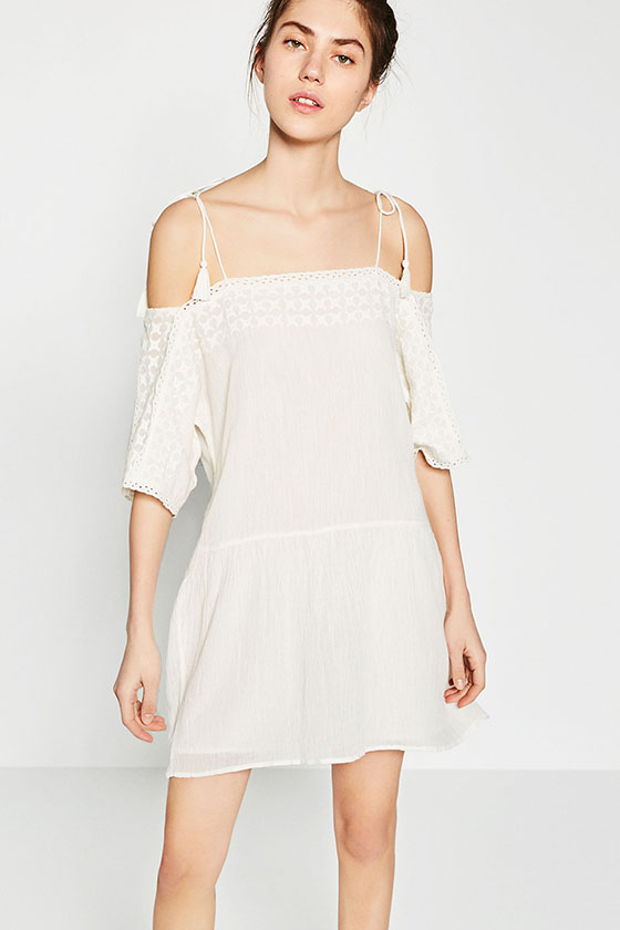 Pero si te sientes incómoda con este tipo de escote, aunque te encante, Zara te proporciona una solución con este vestido que deja descubiertos los hombros, pero tiene dos tirantes finos que adornan este precioso vestido blanco roto.
