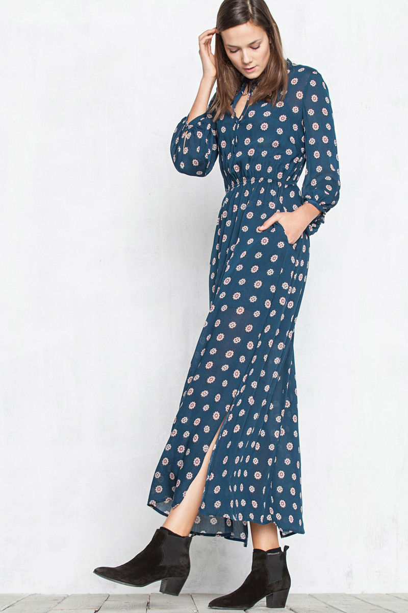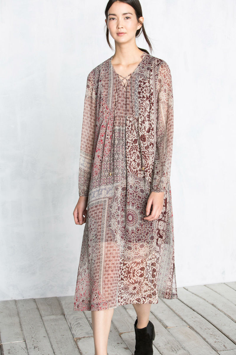 Seguimos con la estética hippie pero en esta ocasión con vestidos de corte midi o al tobillo. Si te fijas, el segundo vestido que te mostramos puede emplearse en una boda campestre cambiando los botines por unos favorecedores tacones y un recogido espectacular.