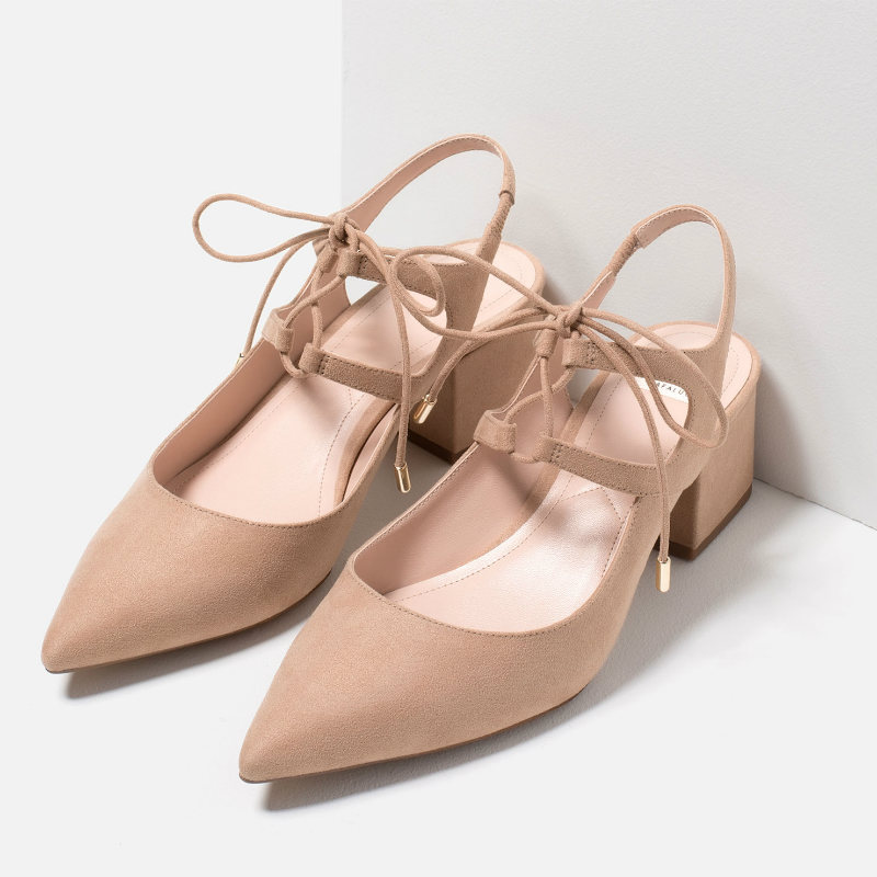 Los tacones bajos también son una buena alternativa para lucir esta temporada. Estos zapatos destalonados en color rosa cuarzo de punta fina y con tacón cuadrado bajo, son simplemente preciosos. El denim, el blanco y el negro y el azul serenidad son sus principales aliados para combinar.
