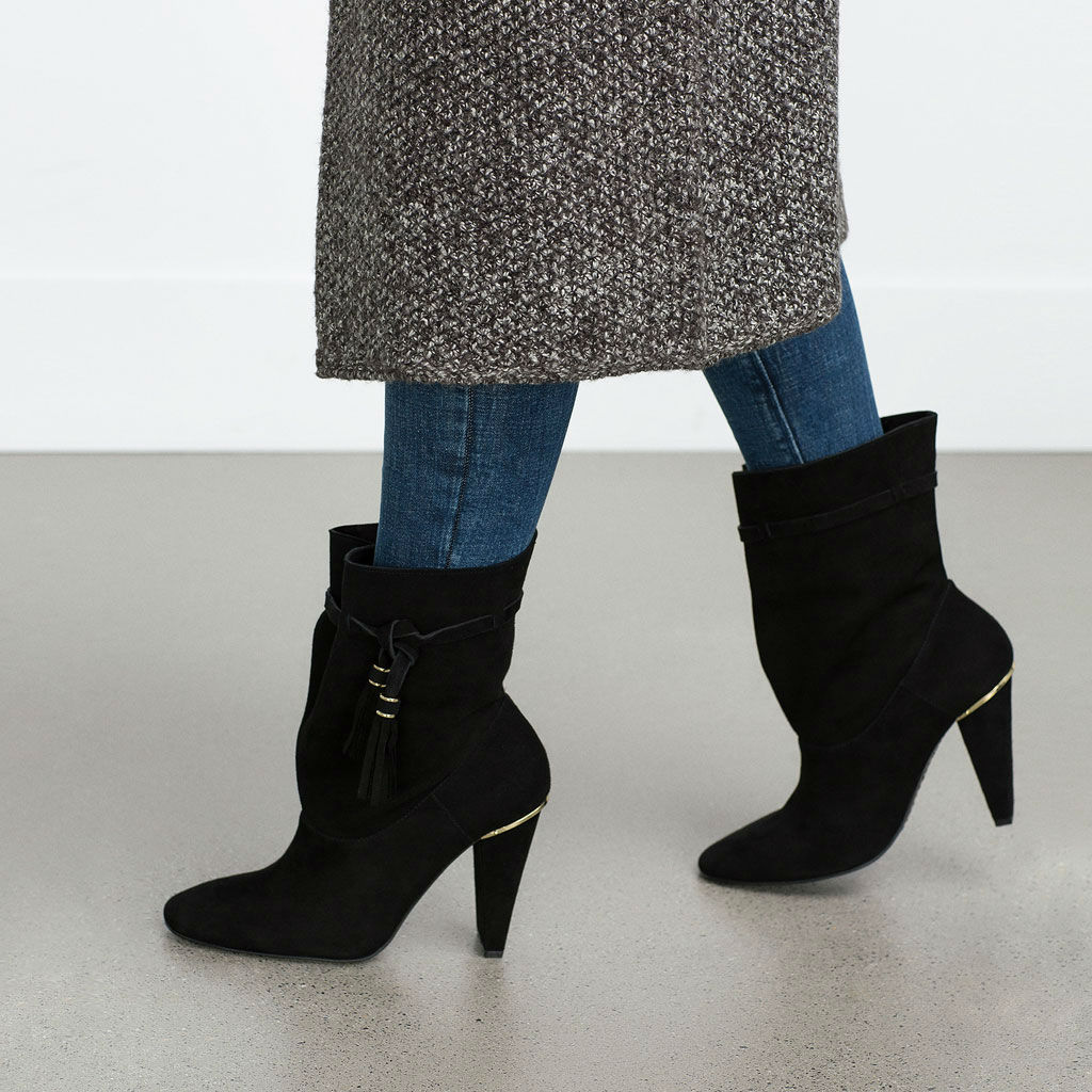 El negro es el que más protagonismo acapara dentro de esta colección. Una tonalidad que equivale a la versatilidad que todas buscamos a la hora de encontrar unos botines que podemos utilizar tanto de día como de noche. Son los detalles los que verdaderamente marcan la diferencia tratándose de un zapato tan básico como este. Cordones, flecos, apliques dorados, asimetrías y suelas track se convierten en los mejores acompañantes de nuestros looks y, sobre todo, de nuestros pies.