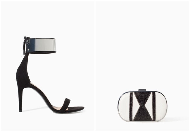Nos encanta el acabado metalizado de este cluth de piel (29’99€) y que conjunta a la perfección con estas sandalias de tacón que incorporan un aplique metálico en el tobillo (15’99€).