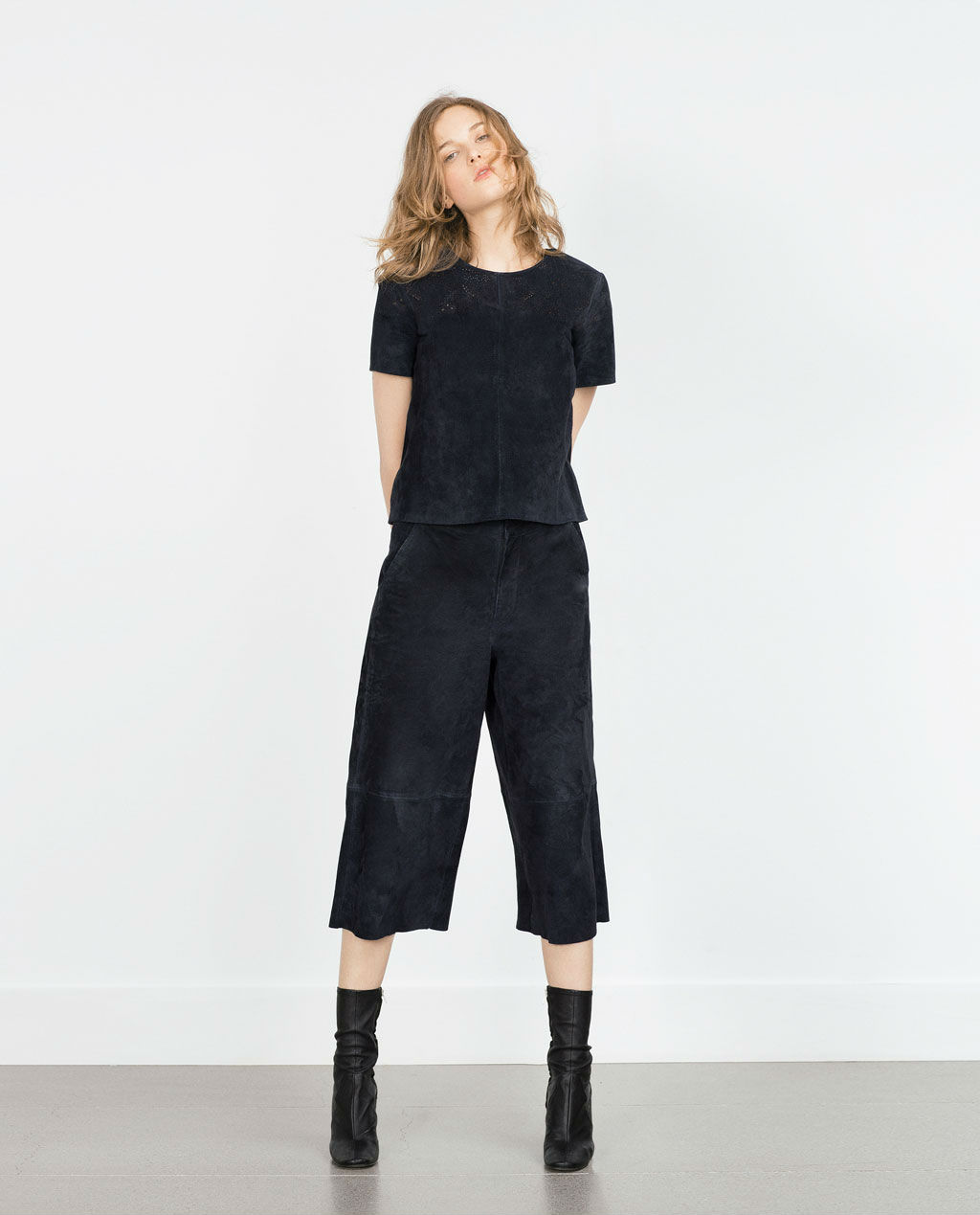 Máxima tendencia durante el 2015, este 2016 promete seguir dando más guerra. Desde las pasarelas directo a nuestros armarios, es una de esas texturas gruesas y rudas que pueden conseguir que un sencillo look se convierta en un potencial combo. Zara incluye en sus rebajas invierno 2016 este top de manga corta elaborado en suede y de color azul marino. Si quieres lucir la tendencia matchy matchy, opta por los pantalones culotte que van a juego con la parte superior.