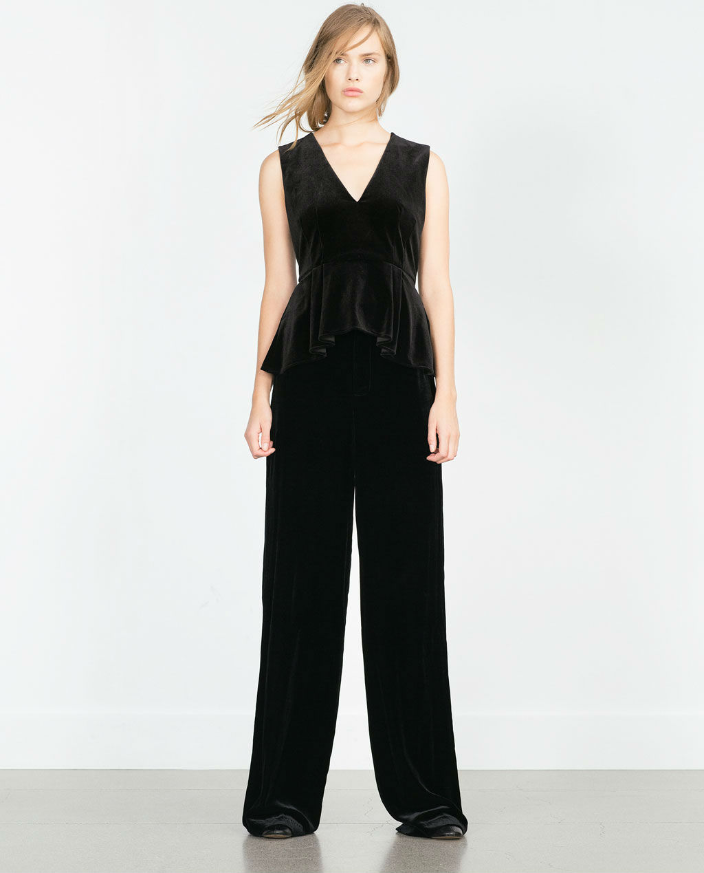Ahora vamos con el terciopelo, otro de los must have que ha arrasado durante el pasado año. Suave, vintage y de lo más retro, puede hacer que tu estilismos se base en la estética sixties en tan solo una prenda confeccionada con velvet. De escote en V y bajo peplum, aporta volumen a tu cintura con este top negro.